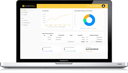 Jurnal Maliya adalah aplikasi akuntansi berbasis online. Pencatatan transaksi bisa dilakukan di mana saja dan menghasilkan laporan keuangan secara real time.